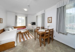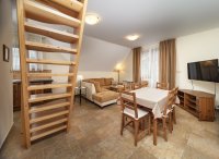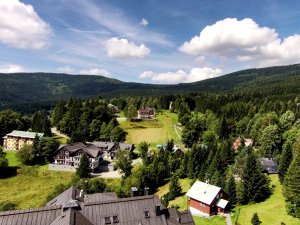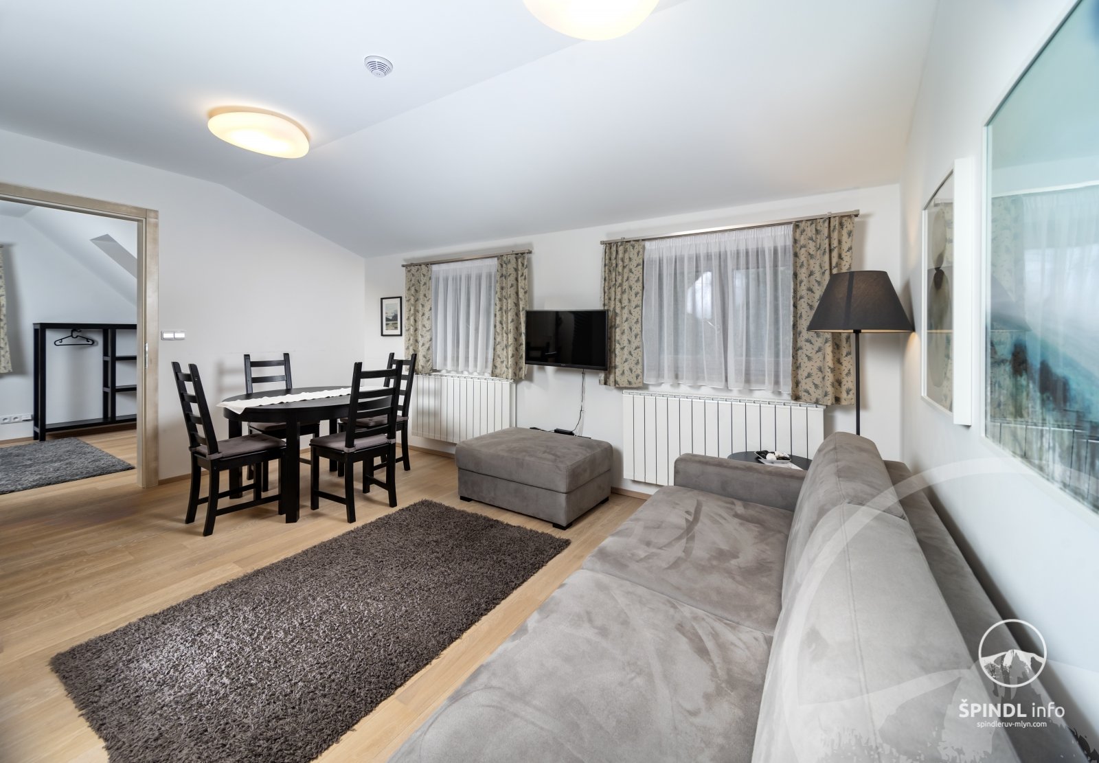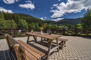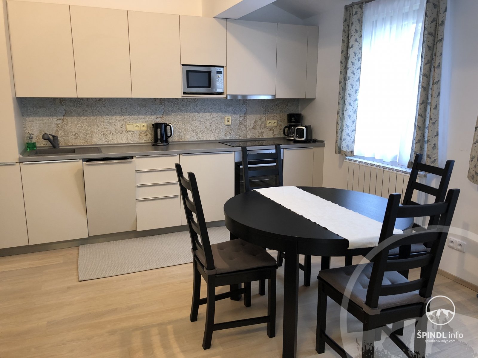 Freuen Sie sich auf Apartments mit einer voll ausgestatteten Küchenzeile. Sanitäre Anlagen befinden sich in jedem Zimmer, Badezimmer mit Dusche und separates WC. Im Erdgeschoss gibt es einen direkten Zugang zur Terrasse. Im Obergeschoss befinden sich 2 stilvolle Wohnungen. Im ersten Stock befindet sich 1 kleinere Wohnung und auch eine geräumige Familienwohnung, die über 2 separate Schlafzimmer und ein Wohnzimmer mit Küche verfügt. Im Dachgeschoss befinden sich 2 kleine Zimmer mit Einrichtungen und einer Küchenzeile, die besonders für junge Paare geeignet sind. Im Sommer gibt es eine Sommerterrasse mit Blick auf das Panorama von Špindlerův Mlýn und das Riesengebirge.