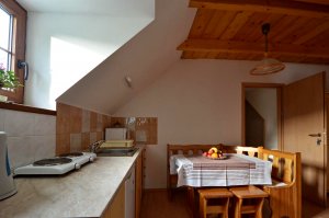 Oferuje 1 apartament dwuosobowy, 1 apartament czteroosobowy i 1 pokój rodzinny dla 4 osób, który posiada aneks kuchenny przed pokojem na korytarzu. Łazienka wyposażona jest w prysznic.